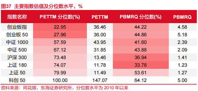 主要指数估值(PE)分位数水平:创业板指<创业板50<中证1000<中证500<沪深300<上证180<上证50<科创50。