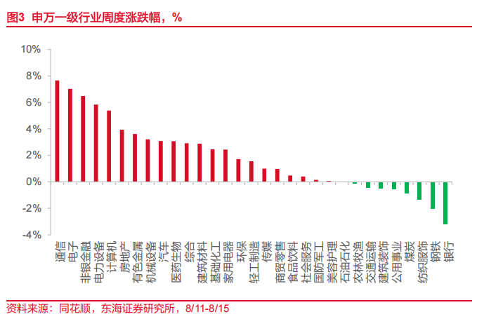 国内权益市场。至8月15日当周,风格方面,成长>周期>金融>消费,日均成交额为20780亿元(前值16748亿元)。申万一级行业中,共有22个行业上涨,9个行业下跌。其中,涨幅靠前的行业为通信(+7.66%)、电子(+7.02%)、非银金融(+6.48%);跌幅靠前的行业为银行(-3.19%)、钢铁(-2.04%)、纺织服饰(-1.37%)。