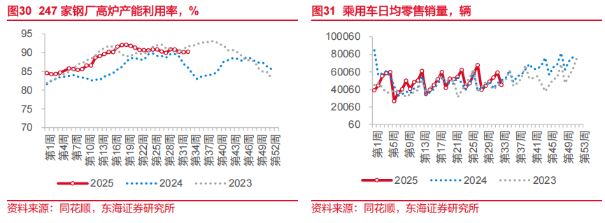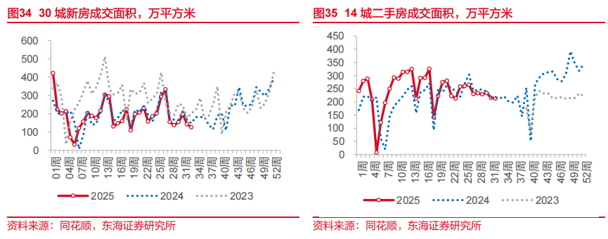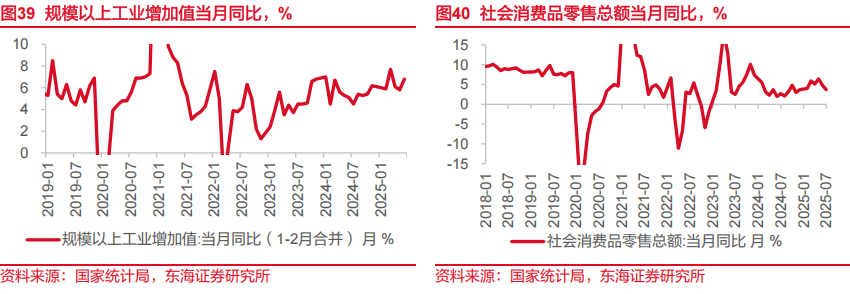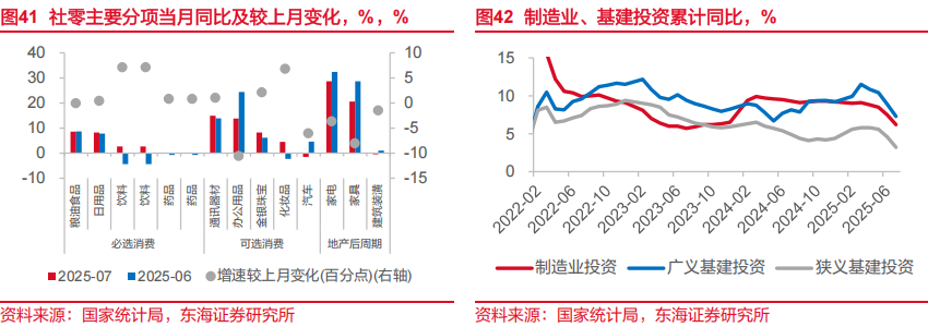 基建增速回落可能受到短期约束。7月当月,广义基建、狭义基建投资增速分别回落至-2.0%和-5.1%。原因上,除了受部分地区高温暴雨、项目工程建设减缓等因素影响之外,我们在此前点评中提到的“两重”项目清单下发阶段性放缓有关,第三批清单下发到实物工作量形成存在时滞。后续来看,以上两点短期影响可能都会逐步减弱,叠加新型政策性金融工具的落地,基建增速可能会有所回升。