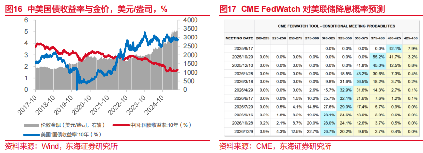 2)利率与人民币汇率。资金方面:7月以来财政资金对货币供应支撑较为明显。同期,部分表外资金回表内亦对银行体系流动性形成支撑。当前宏观基本面仍需要低利率环境支撑,央行支持性态度明确,流动性预计仍将保持宽裕。债市方面,周内市场风险偏好提升,中长期国债收益率普遍上行,短期国债收益率则得益于宽松资金较为平稳。短期内债市收益率“上有顶”(受宏观基本面约束)、“下有底”(受货币政策节奏、“反内卷”政策导向与股债跷跷板效应约束)的格局或难打破,震荡行情有望延续。美债方面,受较好的PPI及消费支出数据影响,9月预期降息幅度收窄,收益率小幅上升。预计中长期视角美债收益率有望逐步回落,就业逐步明朗的情况下,下行空间取决于通胀黏性和财政赤字压力。人民币方面,周内美元指数震荡中小幅下行,人民币窄幅震荡。后市而言,国内经济政策的稳定性、基本面的修复、中美经贸关系改善以及中美利差收窄预期等多重因素为人民币提供有力支撑。