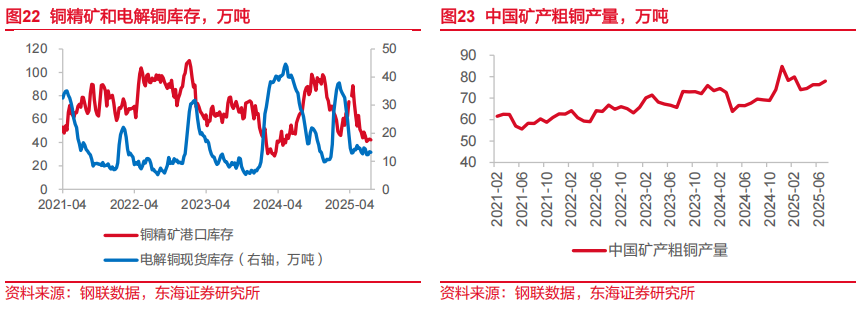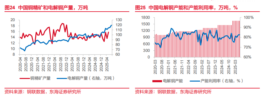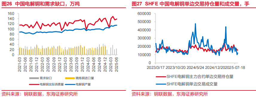 2025年7月,我国电解铜产量约为119.44万吨,环比增长4.1%,同比增幅19.6%,生产能力复苏水平较上期明显恢复,下游需求维持旺盛状态。2025年7月,我国电解铜年化平均产能为1648万吨,产能利用率为86.04%。2025年6月我国电解铜产量和需求缺口约为24.11万吨,缺口较上期环比扩大。我国进口电解精炼铜数量基本可以覆盖生产需求缺口。