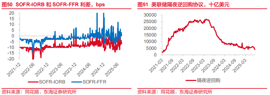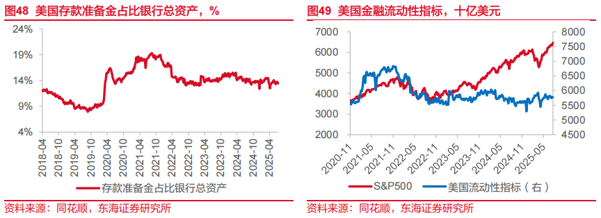 从量的角度,截至8月13日,美国财政部TGA账户继续回补511.5亿美元。同时,隔夜逆回购账户余额当周减少436.7亿美元,为连续第六周净提取,录得2021年5月以来最低余额。存款准备金方面则较为平稳,仅减少20.3亿美元。从7月以来,TGA余额回补资金大部分来源于逆回购账户,存款准备金余额变动反而较小,这也就意味着当前美国国债买家大部分是非银金融机构,而非美债传统买家——银行。我们认为这是由于美国银行机构资产端久期过长,13周及其以上期限债券银行并不愿意投标吸收,反而一些非银机构,包括稳定币发行机构或成为下半年美债的购买主力。