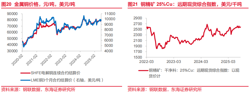 2025年,金属精炼铜价格震荡上行,8月15日,SHFE电解铜连续合约结算价格为79066元/吨,较上一周价格环比上升0.9%,价格与去年同比增长7.2%;LME伦铜3个月合约结算价为9767.5美元/吨。美国延长对中国商品暂缓征税至11月,缓解了关税忧虑,为包括铜在内的大宗品价格提供支撑。8月15日,我国铜精矿干净料(25%Cu)远期现货综合价格指数约为2584.2美元/千吨,价格环比上升0.5%,同比上升9.7%。铜精矿价格较上周价格波动上涨。