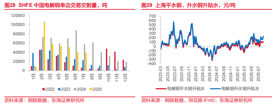 2025年8月15日当周,我国SHFE电解铜持仓量为156140.6手,环比下降2%,本周持仓量下降;成交量为121244手,环比上升20.1%,出现了高换手率、低持仓量的现象,大量短线交易者进场,交易者利用市场短期波动开启频繁交易,多为日内或短持看多或看空者。SHFE电解铜成交量暴增而持仓量下降,主要在于短线交易与换月操作活跃,投机资金频繁进入退出,增强市场交易热度但未形成新持仓。2025年7月,沪铜单边交易交割量为39275吨,低于去年同期交割水平。主要原因是现货需求偏弱,交割意愿下降叠加价格波动收窄,套保空间缩窄。