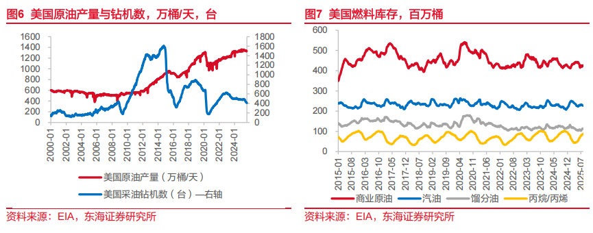 截至8月15日当周,受OPEC增产决议影响,WTI原油周内弱势震荡,周五收于62.80美元/桶,较上周同期下跌1.7%。截至2025年8月8日当周,美国原油产量为1332.7万桶/天,同比增长2.7万桶/天。美国炼厂吞吐量为1718万桶/天,开工率96.4%。8月15日当周,美国钻机数539台,较去年同期减少47台;其中采油钻机数412,较去年同期减少71台。