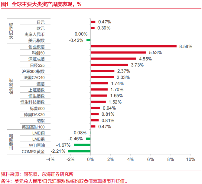 全球大类资产回顾。8月15日当周,全球股市继续普涨;主要商品期货原油、黄金、铜、铝均下跌;美元指数下跌,非美货币升值。1)权益方面:创业板指>科创50>深证成指>日经225>沪深300指数>法国CAC40>道指>上证指数>恒生指数>恒生科技指数>标普500>德国DAX30>纳指>英国富时100。2)市场关注美俄两国元首会晤,油价偏震荡运行;特朗普表示不会对黄金征收关税,黄金价格周内明显回落。3)工业品期货:南华工业品价格指数上涨,炼焦煤、螺纹钢上涨,混凝土、水泥下跌;高炉开工率环比下跌;乘用车日均零售4.52万辆,环比下跌23.61%,同比下跌4.0%;BDI环比下跌0.3%。4)国内债券收益率上行,全周中债1Y国债收益率上行1.59BP至1.3665%,10Y国债收益率上行5.74BP收至1.7465%。5)长短端美债收益率分化。2Y美债收益率当周下行1BP至3.75%,10Y美债收益率上行6BP至4.33%。6)美元指数收于97.8538,周下跌0.42%;离岸人民币对美元持平;日元对美元升值0.47%。
