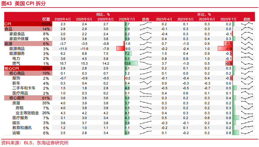 其他核心服务类价格延续上升态势。医疗服务为7月核心服务的主要贡献项。医疗服务同比由前值3.4%上升至4.3%,环比超季节提升至0.8%。我们维持在6月通胀报告的观点:受到《美丽大法案》财政改革影响,医疗补助资金的削减以及医疗部门的裁员使得医疗服务价格不断走高。运输价格同比由前值3.4%略微上升至3.5%,娱乐服务价格由前值3.8%略微上升至3.9%,两者或均受贸易协定陆续敲定以及暑假影响而温和上行。