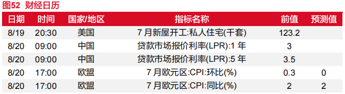 美国PPI反弹与杰克逊霍尔会议预期,美元贬值及风险偏好提升。美国生产者价格在6月份持平后,7月份环比升0.9%,是自2022年6月以来最高增幅,最终需求服务和最终需求商品价格均上涨。美国仍有补库存需求,6月份综合企业库存上升,但库存与销售之比从5月份的1.39降至1.38,而一年前为1.41。从通胀角度,预计中美的贸易关系缓和。一年一度的杰克逊霍尔会议将召开,在欧元区的降息空间与日元的加息空间都不大的情况下,美联储在货币政策独立性与失业、通胀之间平衡备受关注,虽市场对9月预期降息幅度收窄,但是仍然朝着利率向下的方向。美元指数走弱,商品市场通胀尚没有明显迹象,但推动非美资产的表现,风险偏好提升背景下利好权益市场。