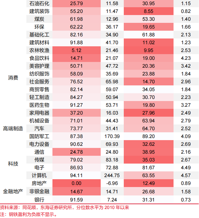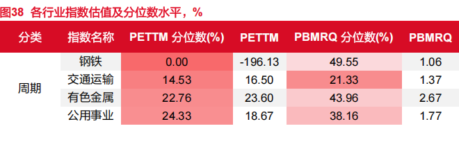 主要行业估值(PE)分位数水平:周期:交通运输<有色金属<公用事业。消费:农林牧渔<食品饮料<美容护理。高端制造:家用电器<机械设备<汽车。科技:通信<传媒<电子。金融(PB):房地产<非银金融<银行。